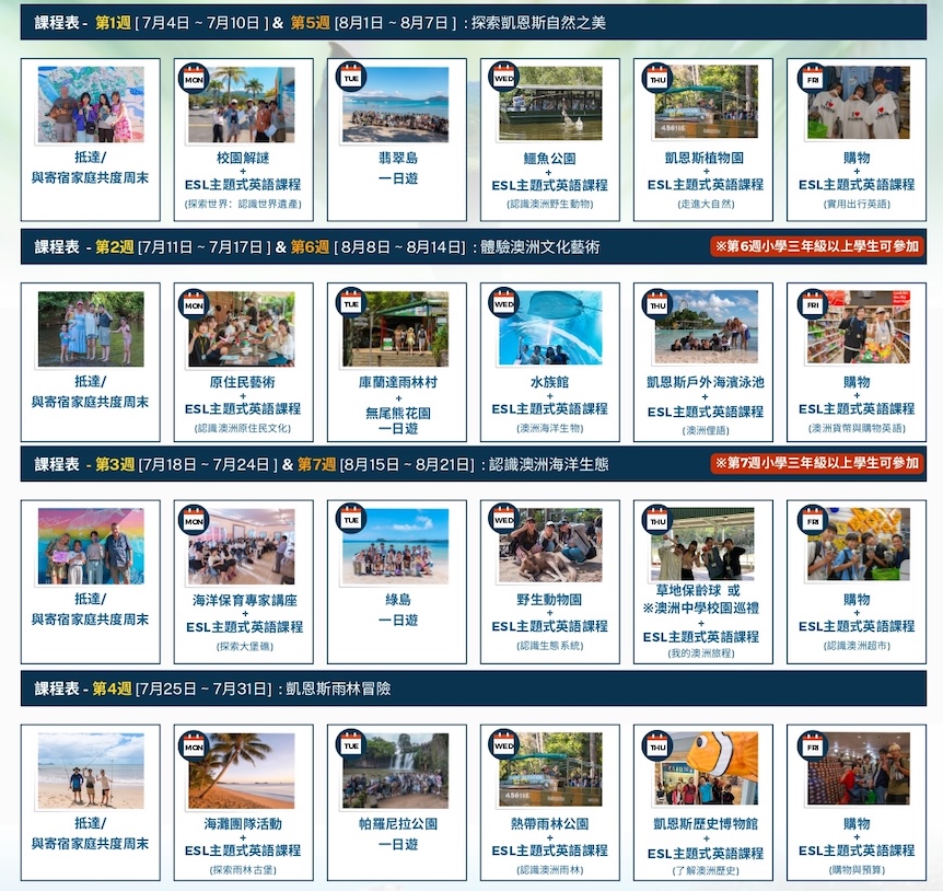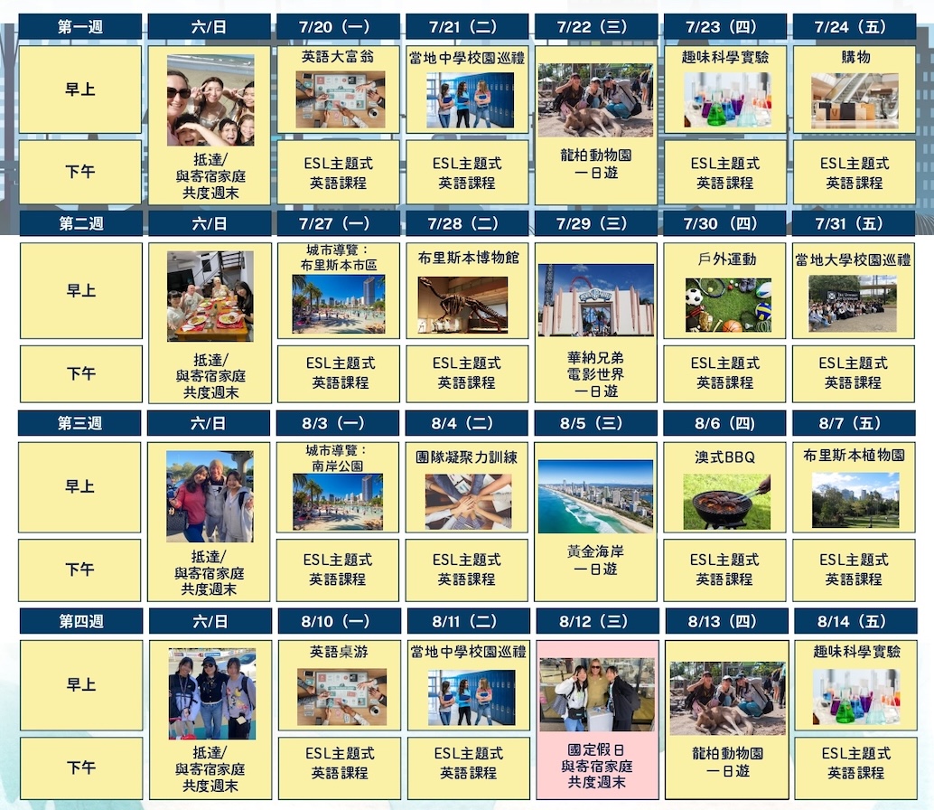 - 上課時間:週一到週五,上午活動、下午上課,週末無活動