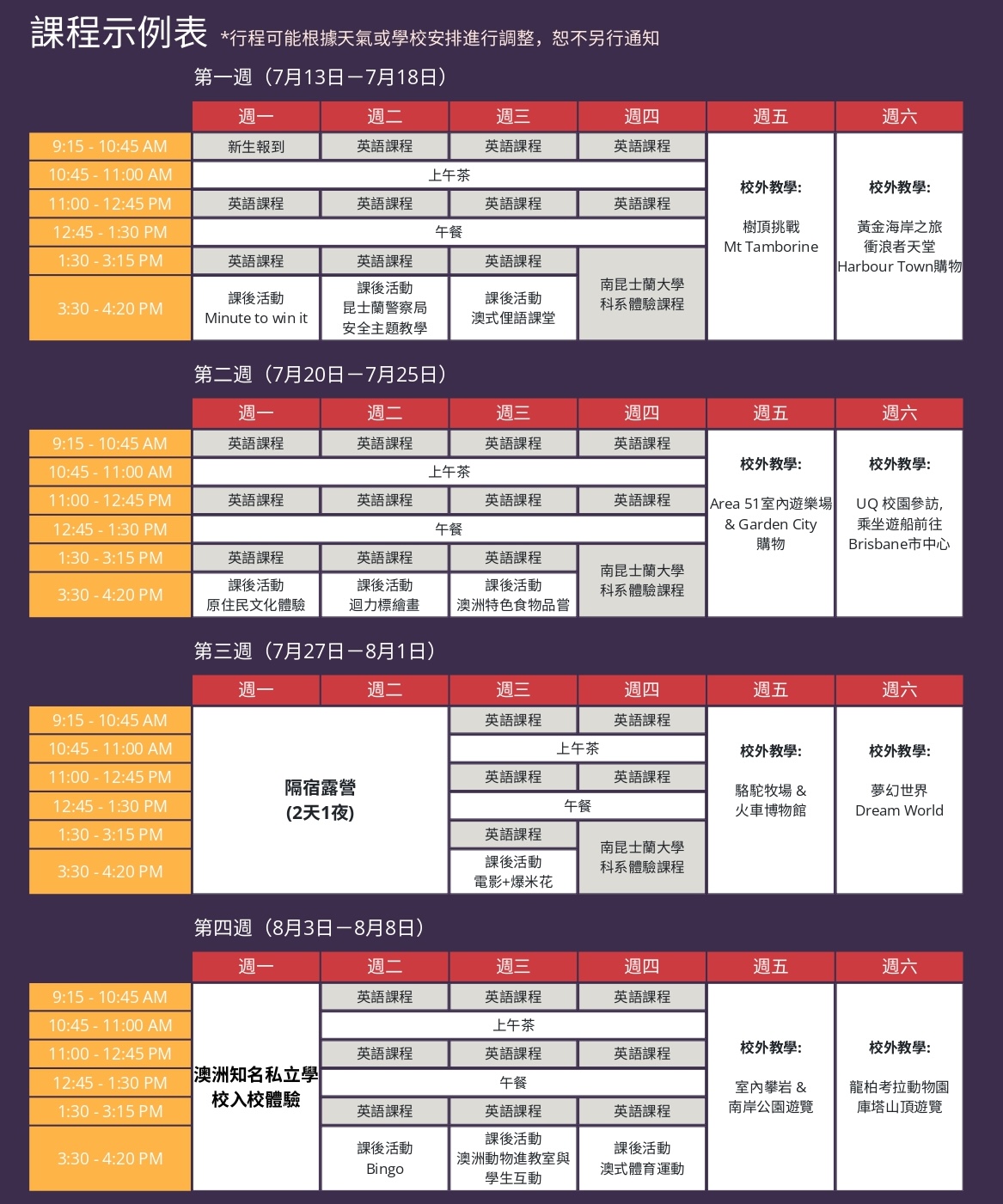 - 營地活動費:AUD$500/兩天一夜(僅適用於報名第三週的學生)