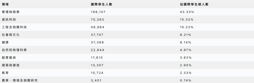 從上表可見,有超過43%的國際學生選擇讀商科,遙遙領先於其他領域。會導致這個情況有多個原因,第一,商科是最多遠距課程的領域,由於我們無法扣除遠距的學生,理所當然國際學生人數也會更多;第二,商科是供應最多的課程,商科領域從傳統的經濟、金融、會計,到供應鏈、行銷、創業等等,各大學都開設非常多的課程,能容納的學生多;第三,留學的知識和技能更容易轉移到自己的國家,這一點可以從農業、教育的國際學生人數得到印證,不是每一個國家都有蓬勃發展的農業,以及每一個國家的教育系統都不一樣,反觀商科、IT都有高度的制式化。